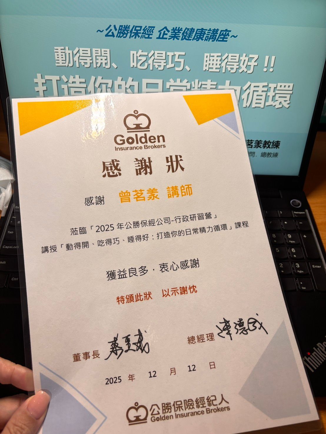 如果你們的公司也在找能量管理、運動與睡眠整合的企業講座,或想要為同仁安排一場 2.5 小時的健康講座專場,讓大家真的動起來、學會用呼吸降壓、把飲食與睡眠安排得更貼近現實,我很樂意把這套方法帶到你們的團隊。