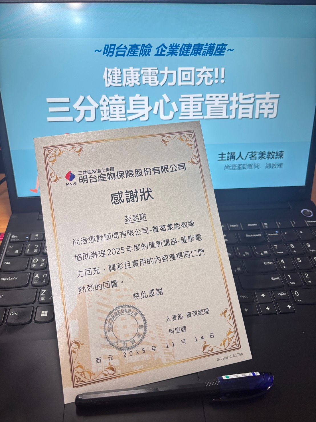 在規劃明台產險的健康講座前,我先花一點時間和職護聊聊最近同仁們的工作節奏與身體感受。職護告訴我,同仁多是長時間文書與高壓節奏,高血壓比例偏高,今年運動會也因交接暫停。我在意的不是「怎麼講得更精彩」,而是:可不可以讓每個人帶走一個「真的可以輕鬆執行的方法」、而且對身體是溫柔的開始。 從理解出發:把現場交還給每一位同仁 講座一開始,我讓同仁先產生覺察,去關注自己壓力源及身體狀態,同仁關心的健康議題不外乎是睡眠品質不佳、體態容易變化、身體有痠痛狀況,還有疲累感不易恢復。這些反饋比任何KPI都更真實。我沒有急著丟很多專有名詞,而是用最淺顯易懂的說明,期待幫大家找到一個能踏出去的第一步:不比誰做得多,只在意自己今天能不能稍微好一點點。 我把講座改成互動+實作的節奏,讓互動成為載體,使更多的理解能落實到同仁心上。短短幾分鐘,大家可以跟著練習呼吸、做幾個不需要換裝的微訓練動作;那些絲毫不費力、不張揚的小動作,像是讓呼吸變得順暢、抬起肩背不那麼拉扯,就會在心裡留下記憶點,利用簡單的動作來減小阻力,會更願意去做。很多時候,對「身體可以恢復」的信心,就是這樣被一點一滴地累積回來。 小組的力量:互相看見與支持 現場我安排每組4–5人,讓每個人都有被支持的感覺。跟小組同仁說出自己感覺最深刻的情境、哪個動作最有感,當我們願意被彼此看見,行動就比較不會孤單。大夥兒討論下一週可以一起執行的123身心重置流程,那天的討論聲不大,卻很實在。 123身心重置流程:為自己排一個不費力的「停頓」 講座裡,我帶大家用「123身心重置流程」作為起點。不是標準化的一套,而是一張空白的小地圖: 1,選一種舒服的呼吸節奏,加上一個做得到的小幅度活動及伸展,就成為一套課表; 2,尋找二個最容易做的時機點; 3,約定好一起執行的頻率,一週做三次。 我請每個小組討論、各自設計自己的版本,有人把它放在「固定整點時操作」,有人選在「固定事件後執行」;有人把動作換成更溫和的肩胛滑動,有人只想從幾次深呼吸開始。最後邀請其中一組分享他們的版本,大家聽完會心一笑,因為它真的做得到。 我想留下的是一種對自己的善意 高壓與久坐不會因為一場講座就消失,但一個被好好對待的身體,會比較願意配合我們過日子。我希望同仁們在離開教室時,心裡記得三件事:不用逞強、不用完美、也不用等有空才開始。只要在今天,為自己安排一次短短的、簡單的停頓就好。 之後的回聲 有同仁反饋,回到座位那一刻想起了教練說的「123護一身」,也有人對超慢跑可以這麼輕鬆感到訝異,還有些人了解壓力與睡眠的連結關係後,更知道「好好睡」真的很重要。我相信改變是輕輕的,不一定立刻看得見,但會在日子裡慢慢累積。當一個人願意開始,旁邊的人就更容易跟上,部門間的工作氛圍也會跟著變得柔軟一些。 也感謝明台產險給我機會可以跟同仁們分享這些,讓我的專業可以協助同仁更輕鬆地邁向健康,讓健康職場更落實! #一點點尾聲 如果你的團隊也在忙碌與壓力之間找不到喘口氣的空間,我很願意用這樣溫和、可落地的方式,陪同仁把健康放回日常。你可以私訊我,我會先聽你說,然後再想怎麼一起走接下來的每一步。歡迎透過E-Mail或是Line官方與我聯繫。 E-Mail:mailme.scsc@gmail.com <健身教練的筆記本>Line官方